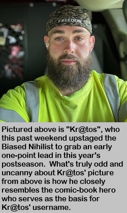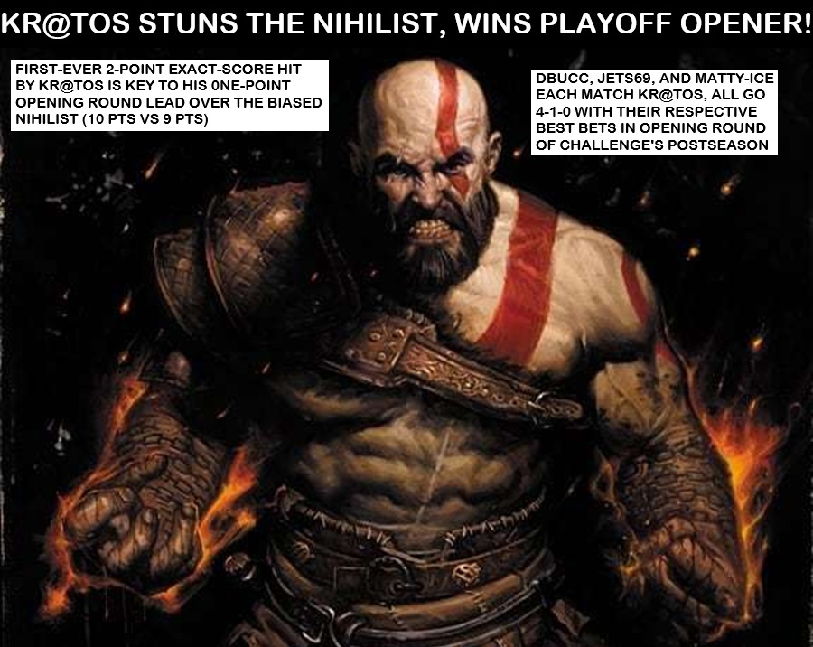 Parts Unknown (DP--Disassociated Press): The Bookie Challenge's 15th overall playoffs got underway with a bang over the past weekend after the handicapper who hails as Kr@tos stunned the Biased Nihilist to take a one-point lead of 10 points versus nine points over the self-proclaimed "Greatest Handicapper of All Time". The Nihilist had to tip his hat to Kr@tos after Kr@tos' riveting start to this year's postseason: "Man, I never saw that coming", said the Nihilist, "and I'll be the first to admit it--he really deserves a round of applause because he had a hell of an opening round." The Nihilist entered this year's postseason as the regular-season champion and and as such was afforded the best scoring advantages in the opening round of this season's playoff, while Kr@tos went into the opening round as a divisional champion and thus held the second-best scoring advantages to open up this year's so-called "second season". The main goal for those handicappers who enter a Challenge's postseason without the scoring advantages of a regular-season champion is to try their hardest to stay within close proximity of the regular-season champion, and if at all possible, try to also negate altogether the scoring advantages of a regular-season champion. For that matter, every handicapper who has "lower" playoff qualifications when they enter a Challenge postseason must strive to stay within a reasonable striking distance of those participants who have the best playoff qualifications after the first-two rounds of a Challenge playoffs. If several handicappers with lowly playoff qualifications can survive the first-two rounds of a postseason without spiraling down to extreme point-total deficits, then they have the opportunity to perhaps pull off some handicapping magic for the last-two rounds of a Challenge postseason, when all handicappers are under the same scoring format. With all the aforementioned kept in mind, Kr@tos accomplished precisely what he needed to do, and if only for the opening round of this year's postseason, he fired the first meaningful salvos of this year's playoffs, which was something akin to punching the Biased Nihilist on his big-ass mouth. In other words, Kr@tos flipped the script over the past weekend, and at least for the time being, he snapped the Biased Nihilist's supreme reign over the handicappers of this year's Bookie Challenge competition. Now granted, Kr@tos did well in the first round of this year's postseason to offset the Biased Nihilist's scoring advantages, but a one-point lead after the opening round does not guarantee that a significant playoff run is forthcoming. On the contrary, kr@tos, whose username is derived from a comic-book figure known as the "God of War", cannot rest on his laurels from this past weekend's opening playoff round, for he still has his work cut out for himself if he wants to win this year's overall Bookie Challenge championship. To be sure, winning an overall Bookie Challenge championship is no easy task and only handicappers who stay the course and pick NFL pointspread winners at a high rate in the Challenge's postseason will achieve the competition's most coveted goal--to seize the day and capture an overall Bookie Challenge championship, not to mention the lucky participant will also pocket the first-place prize of the competition's Latinum jackpot ($400). After the opening round of this year's postseason went into the books, only three handicappers were able to separate themselves from the rest of the pack of handicappers participating in this year's postseason. As already mentioned, Kr@tos is presently the top front-runner of this year's playoff standings after garnering 10 overall points. Not to be totally outdone, the Nihilist is currently in second-place in the playoff point standings after chalking up nine points in the opening round, and at the present time he just trails Kr@tos by one point. Then there is Vikings17, who finished his opening round with seven points scored and who culminated his weekend in third place in the playoff point standings. After accounting for the first-three front-runners in the playoff point standings, there is a three-point drop off in the point standings to get to the next group of handicappers, of which six handicappers are deadlocked in total points with four points apiece. And after applying the league's tiebreakers to the six handicappers in question, what follows is the official order as it pertains the six participants who are tied with four points apiece: dbucc (4th place in pt standings), 7mick7 (5th place), Jets69 (6th place), Kennypie86 (7th place), jcvike28 (8th place), and Matty_Ice (9th place). Lastly, the remaining point standings is rounded off by two handicappers who are tied with three points apiece, of whom are Driveline (officially in 10th place) and Blitzkrieg (11th place). Moreover, there were two handicappers over the past weekend who did not post any weekly selections whatsoever. The two handicappers were TCU and Theopholis, and it's not known if both handicappers have officially quit this year's competition and plan to not participate in the remaining three rounds of this year's playoffs. Of note, both TCU and Theopholis probably failed to post any picks for this year's opening round because of their lowly playoff qualifications, of which their playoff qualifications were those of being "at-large participants". It was a shame that both handicappers failed to post any picks because two other "at-large participants"--rookies Kennypie86 and Matty_Ice--both tallied four points apiece in the opening round and are in the mix with all the other handicappers who registered four points in this year's playoff opener. Granted, "at-large participants" are at a huge scoring disadvantage in the opening round of a Challenge playoffs, as they can only submit five best bets that are worth only one point apiece and are not eligible to submit parlay combinations. However, even though "at-large p