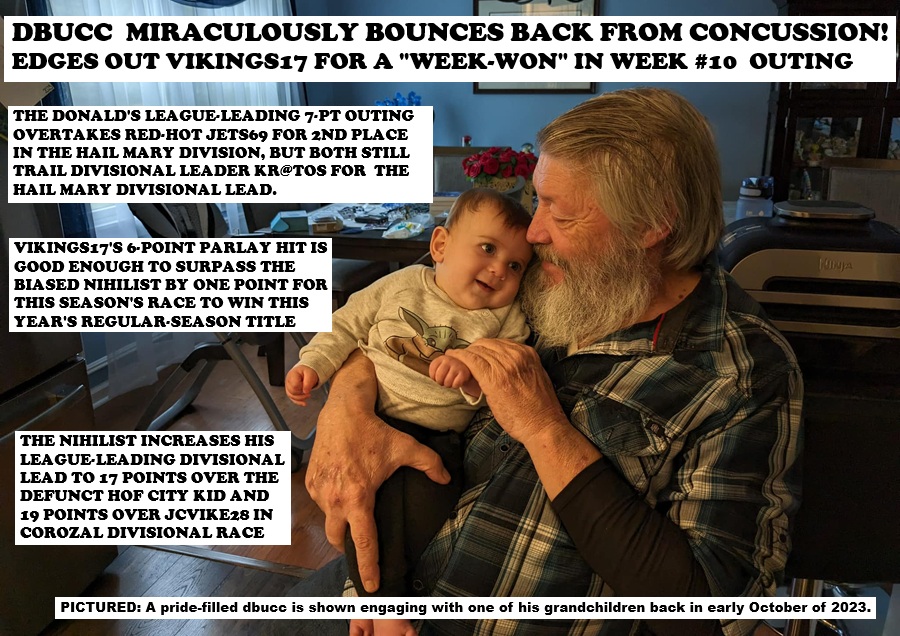 Parts Unknown (DP--Disassociated Press): It only took two weeks for the suspense in this year's divisional races to get going in earnest. The two big winners for the 10th weekend of this year's competition were dbucc and Vikings17, both of whom landed respective 6-point parlay hits for the first time this season. But it was dbucc who dramatically edged out Vikings 17 for a week-won after he complemented his parlay hit with a best-bet winner and finished his outing with seven total points, whereas Vikings17 failed to register any best-bet winners and had to settle for a 6-pont outing to his weekend. The dazzling performance by dbucc this past weekend was as logic-defying as it was breathtaking, especially when considering that he was able to snap a year-long handicapping slump with a season-saving outing in which he turned the tables of the Hail Mary divisional race upside down and made a miraculous comeback of sorts after recently suffering a severe concussion. Entering this past weekend, the Donald (aka dbucc) was in third place in the Hail Mary divisional race and trailed the division's leader Kr@tos by 14 points (24 pts vs 10 pts) and also trailed second-place Jets69 by three points (13 pts vs 10 pts). However, after this past weekend's handicapping action went into the books, the Donald's magnificent outing enabled him to leap over second-place Jets69 and claim the division's wild-card slot by a season-long tally of 17 points versus Jets69's 15 points for the season. Additionally, after this past weekend dbucc was able to slice Kr@tos' 11-point divisional lead to eight points (Kr@tos 25 pts vs dbucc's 17 points). [URGENT UPDATE FOR THIS WEEK'S THURSDAY NIGHT GAME! DBUCC CONNECTED ON A 5-PT EXACT-SCORE PICK--NE 27-14--AND NOW TRAILS KR@TOS FOR THE HAIL MARY DIVISIONAL LEAD BY JUST THREE POINTS (25 PTS VS 22 PTS!)] The divisional comeback by dbucc after his 7-point outing from this past weekend and his 5-point exact-score hit to start this week's handicapping (wk #11) is reminiscent of the stupendous and inspirational handicapping from Challenge year #11, when dbucc won his first and so far his only Bookie Challenge championship. Back then, dbucc had to fight off some seriously emotional adversity after having lost his beloved wife Diane in the off-season prior to the start of the 11th annual Bookie Challenge competition. Up until several weeks ago, dbucc had been in the midst of a ho-hum season, but then came his accident at his home that jeopardized dbucc's future handicapping for this competition. More specifically, nearly a month ago dbucc was walking into his kitchen then he suddenly lost his footing and fell down but not before he hit his head hard against the edge of the kitchen counter, which resulted in lacerations to his head and a severe concussion. The week of the accident, week #6, dbucc was in no shape to post his weekly selections. What's more, his concussion was so severe that he had to be hospitalized and the effects from the concussion had him disoriented to the point he couldn't talk coherently and he had even suffered some memory loss. Before the start of last week's handicapping action, dbucc called the Biased Nihilist to explain what was going on, but it didn't take long before the Nihilist realized that dbucc was still slightly confused mentally and that he wasn't making a whole lot of sense. In any event, that Sunday morning before the start of this past weekend's games the Nihilist called dbucc so that he could help him make his weekly selections. As it turned out, dbucc incredibly hit a 6-point parlay and a best-bet winner to end his weekend with seven points, and then as everybody now knows--dbucc hit this Thursday night's exact-score and as a result he sliced Kr@tos divisional lead in the Hail Mary division to three points. In sticking with dbucc's performance over the past weekend, the 6-point parlay winner he nailed down was his 15th all-time for regular-season handicapping, and it is his 16th overall if including his 6-point parlay hit in the postseason of Challenge year #11, or the season in which he produced his fascinating breakout season to win that year's overall Bookie Challenge championship. But if the truth be told, the Donald is not known for having a big-time propensity for knocking down 6-point parlay hits throughout his 12-year Bookie Challenge career, to include this season. Oh no, with the exception of his scintillating championship run of Challenge year #11, the season in which dbucc tallied a career high of four 6-point parlay hits, the fact is that the "Joker" normally averages only about one 6-point parlay winner per season. In fact, he is better known over his Challenge career for being the league's number-one best-bet handicapper, which is clearly evident after he entered this year's competition with the league's top lifetime best-bet numbers, of which were a rock-solid 281-212-11 all-time best-bet tally that factors out to an all-time best .570 winning percentage. With all the aforementioned in mind, however, dbucc's best-bet handicapping for this year's competition has been sluggish, for his best-bet numbers after this past weekend for the season are at a below-average tally of 7-11-0 (win% .389), which is an uncharacteristic best-bet record for the league's top all-time best-bet handicapper. But the poor best-bet start to this season was offset by dbucc's season-changing handicapping of late. For starters, the 6-point parlay winner and the week-won that dbucc registered this past weekend were his first since the last weekend of last year's regular-season. Secondly, and more importantly, the clutch handicapping performance snapped a handicapping slump by dbucc that spanned over the course of the last four weekends, of which dbucc scored only one-point over the aforementioned four-week stretch and also goose egged three out of those four weekends. In the case of Vikings17, his 6-point outing from this past weekend enabled him to exten